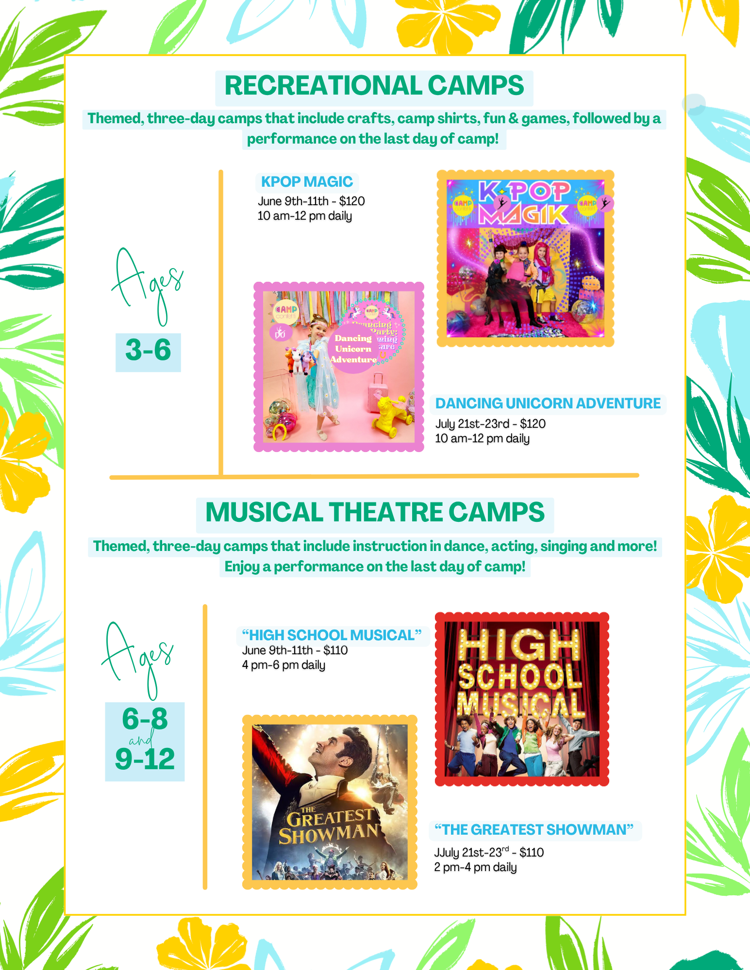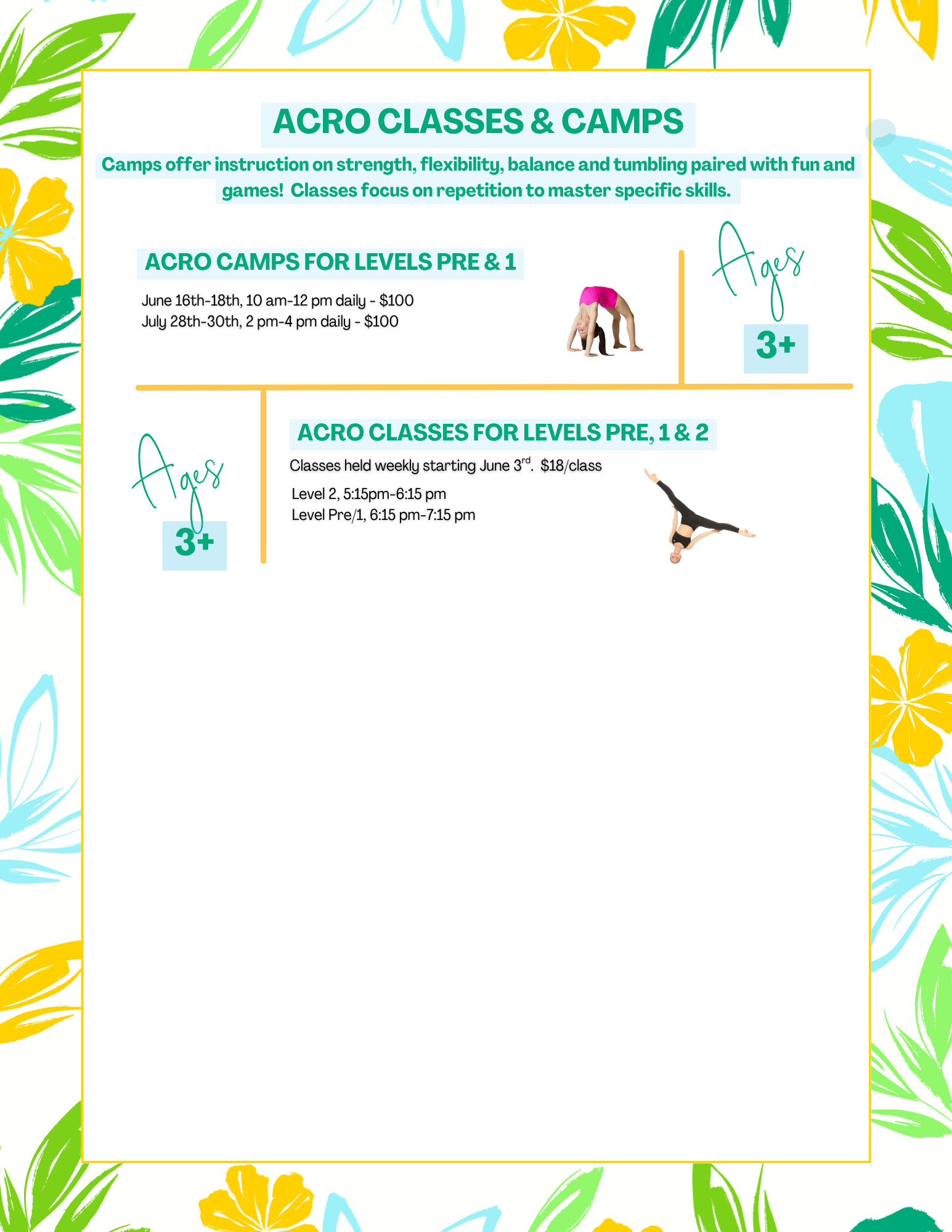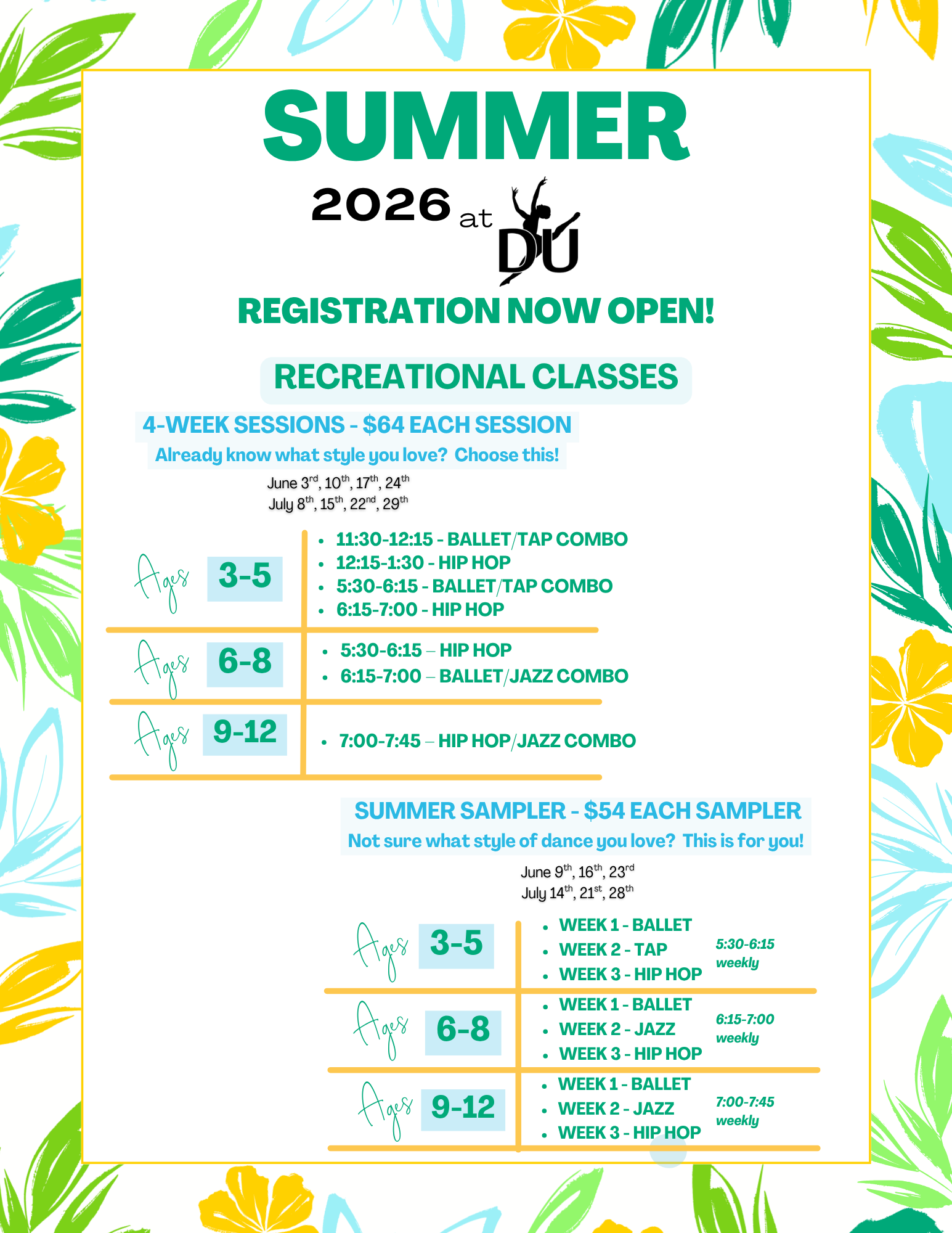 Classes begin June 3rd. Offering 3-week Samplers, 4-week sessions and a variety of camps!